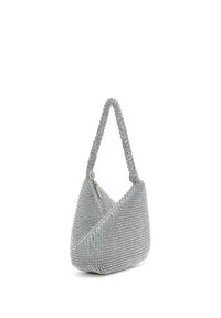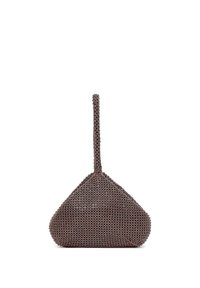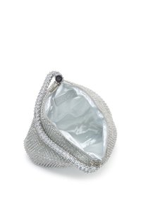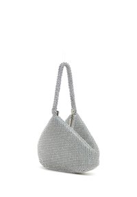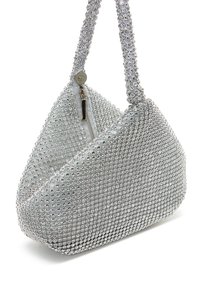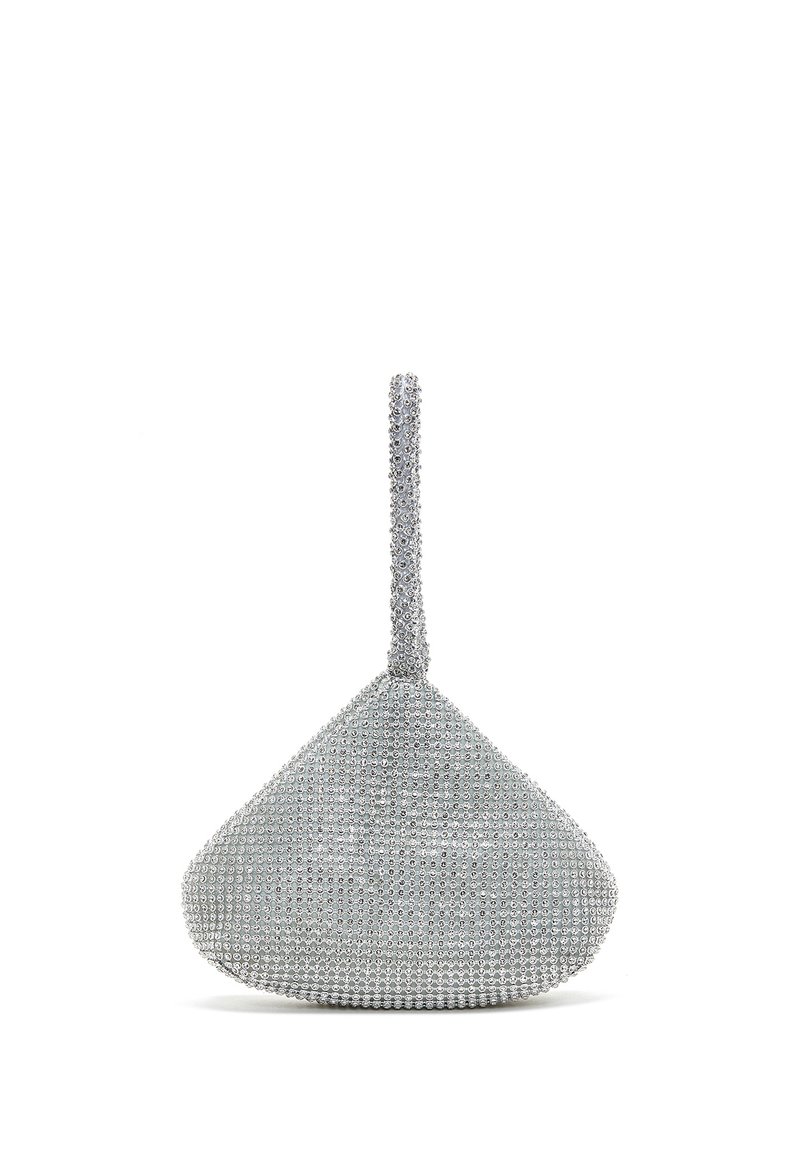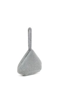 Zilveren driehoekige avondclutch met polsbandje, volledig bedekt met kleine glinsterende strass-steentjes, getoond op een witte achtergrond.