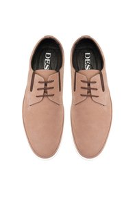 Tan suède schoenen met een lage profiel, een gladde oppervlak, witte zool en bruine veters. Heeft minimale stiksels en uitsparingen aan de zijkant.