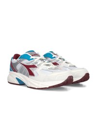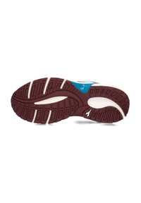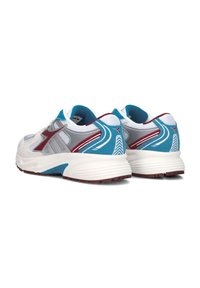 Witte sportschoen met grijze en teal accenten, voorzien van een bovenwerk van mesh, een gevoerde kraag, ronde neus en een rubberen zool met bordeauxrode details.