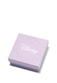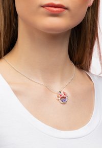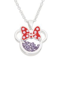 Zilveren ketting met een charm in de vorm van een rode stipjes strik en een paarse middenstuk, gedragen tegen een effen wit shirt.