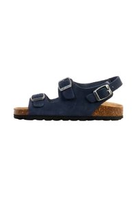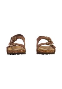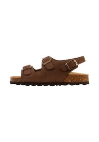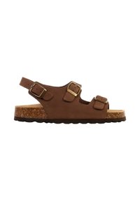 Bruine sandaal met kurken zool, twee verstelbare gespen aan de voorkant en een enkelbandje, zijaanzicht tegen een witte achtergrond.