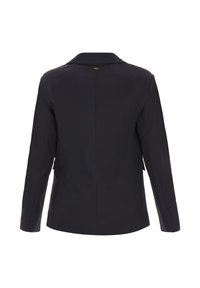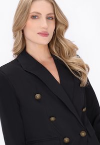 Blonde vrouw met golvend haar, gekleed in een zwarte double-breasted blazer met gouden knopen en een zwarte broek tegen een witte achtergrond.