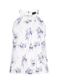 Vrouw met licht golvend haar, draagend een mouwloos wit topje met beige bloemenprint, staand tegen een effen witte achtergrond.