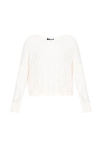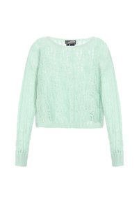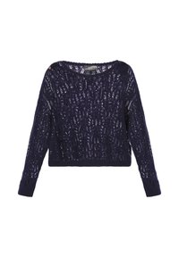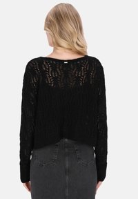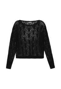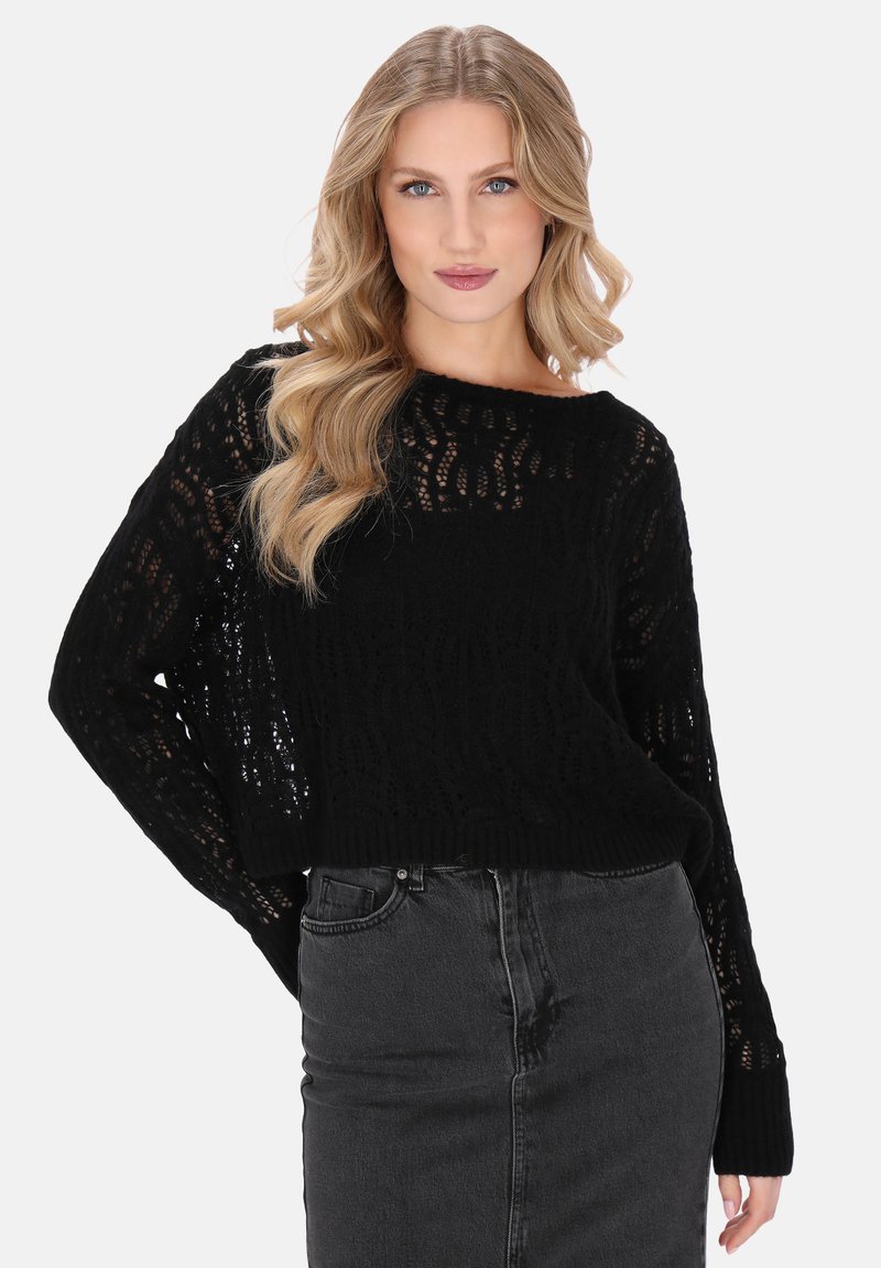 Zwart cropped gebreide trui met een ingewikkeld open steekpatroon, ronde hals en lange mouwen, gecombineerd met een aansluitende donkergrijze denim rok.