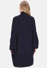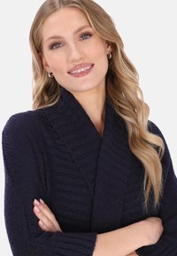 Donker marineblauwe gebreide cardigan met een sjaalkraag, een open voorkant en losse mouwen. Voorzien van patroonstructuren en een ontspannen, draperende vorm.