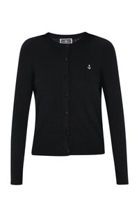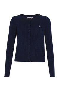 Vrouw met lang blond haar die een marineblauwe gebreide cardigan met knopen en een ankerembleem draagt, gecombineerd met een witte broek, tegen een effen achtergrond.