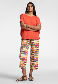 Vrouw met lang zwart haar draagt een losse oranje top met korte mouwen en kleurrijke broek met abstract patroon, poseert met één hand in de zak.