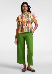 Vrouw met lang zwart haar, goudkleurige oorbellen en armband, een kort mouwtjes top met een abstracte print in meerdere kleuren, en groene broek, staand met haar hand in de zak.