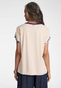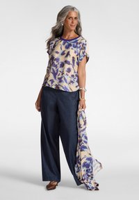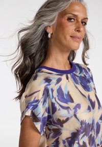 Volwassen vrouw met lang grijs haar, gekleed in een beige top met korte mouwen en paarse bloemenprint, en donkerblauwe broek, voorzien van armbanden.