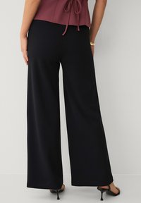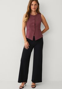 Vrouw die zwarte wijderechte broek, bordeaux top, gouden armband en zwarte sandalen met hoge hakken draagt, staand tegen een witte muur.