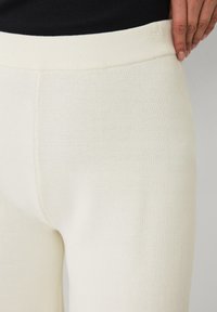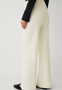 Vrouw draagt crème kleurige, gebreide wijde broek met hoge taille en zwarte ballerina's met ronde neus, staand tegen een effen lichte muur.