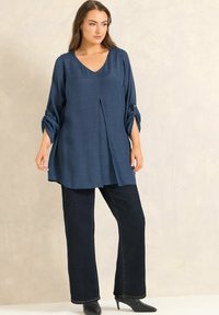 Vrouw draagt een losse, lange mouw navyblauwe blouse met V-hals en aangesloten mouwen met knoopsluiting, staand tegen een eenvoudige lichte achtergrond.