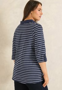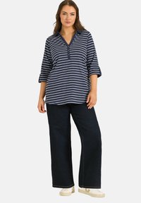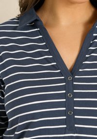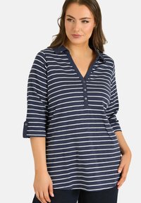 Vrouw draagt een donkerblauw-wit horizontaal gestreept overhemd met kraag, driekwart mouwen en knoopdetails, staand met één hand in de zak.