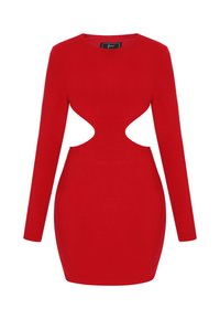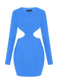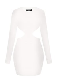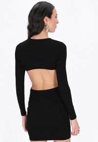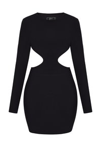 Vrouw met lang donker haar die een zwarte jurk met lange mouwen en zijkanten uitsparingen draagt, staand tegen een effen witte achtergrond.