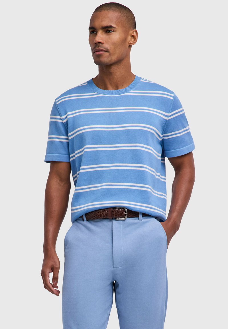 Gestreept T-shirt met korte mouwen in marineblauw en wit, met een ronde hals en effen marineblauwe afwerking bij de mouwen en de zoom. Zachte stof, casual pasvorm.