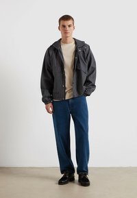 Beige katoenen T-shirt met een ronde halslijn, korte mouwen en een geborduurd logo op de linkerborst. Gecombineerd met een blauwe spijkerbroek.