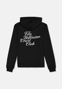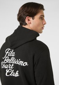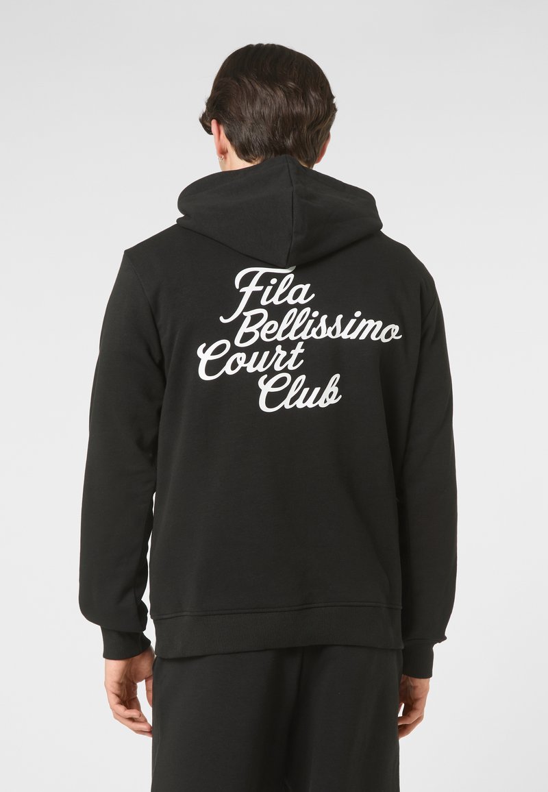 Man die een zwarte hoodie draagt met witte tekst "Fila Bellissimo Court Club" op de achterkant, staand tegen een effen achtergrond.