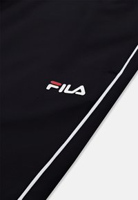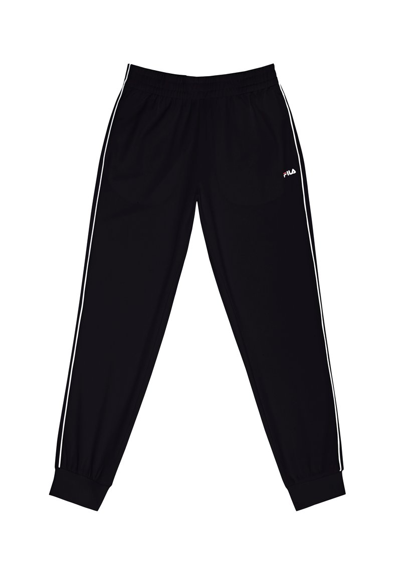 Zwarte sportbroek met witte biezen aan de zijkant, een elastische tailleband en boorden, en een klein FILA-logo op de bovenste linker dij.
