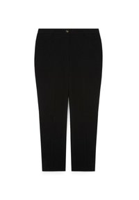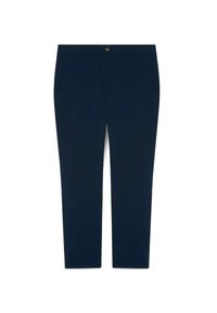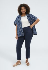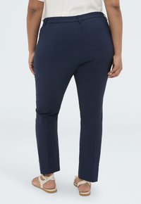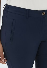 Persoon die marineblauwe slanke enkellange broeken met een zijsplit en beige sandalen met open teen draagt, staand tegen een effen lichte achtergrond.
