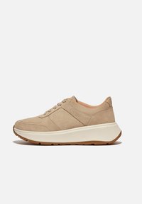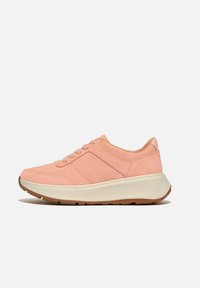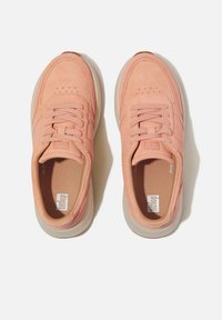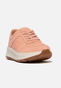 Lichtroze suède sneakers met een ronde neus, vetersluiting en een contrasterende witte zool. Draag ze met lichtblauwe jeans met omgeslagen pijpen.