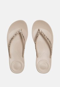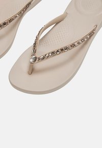 Beige teenslipper met een licht verhoogde zool en een met juwelen versierde band, zijaanzicht op een witte achtergrond.