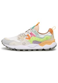 Multikleurige sneaker met suède en mesh materialen, een chunky zool, patroonaccenten en contrasterende veters. Zijaanzicht met een lage profiel.