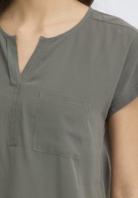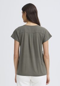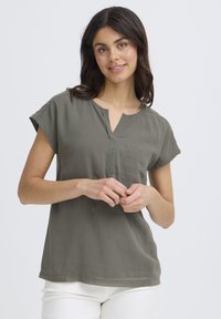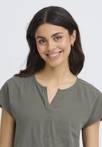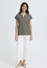 Jonge vrouw met donker haar, gekleed in een olijfgroene blouse met korte mouwen en witte broek, staand en glimlachend tegen een effen achtergrond.