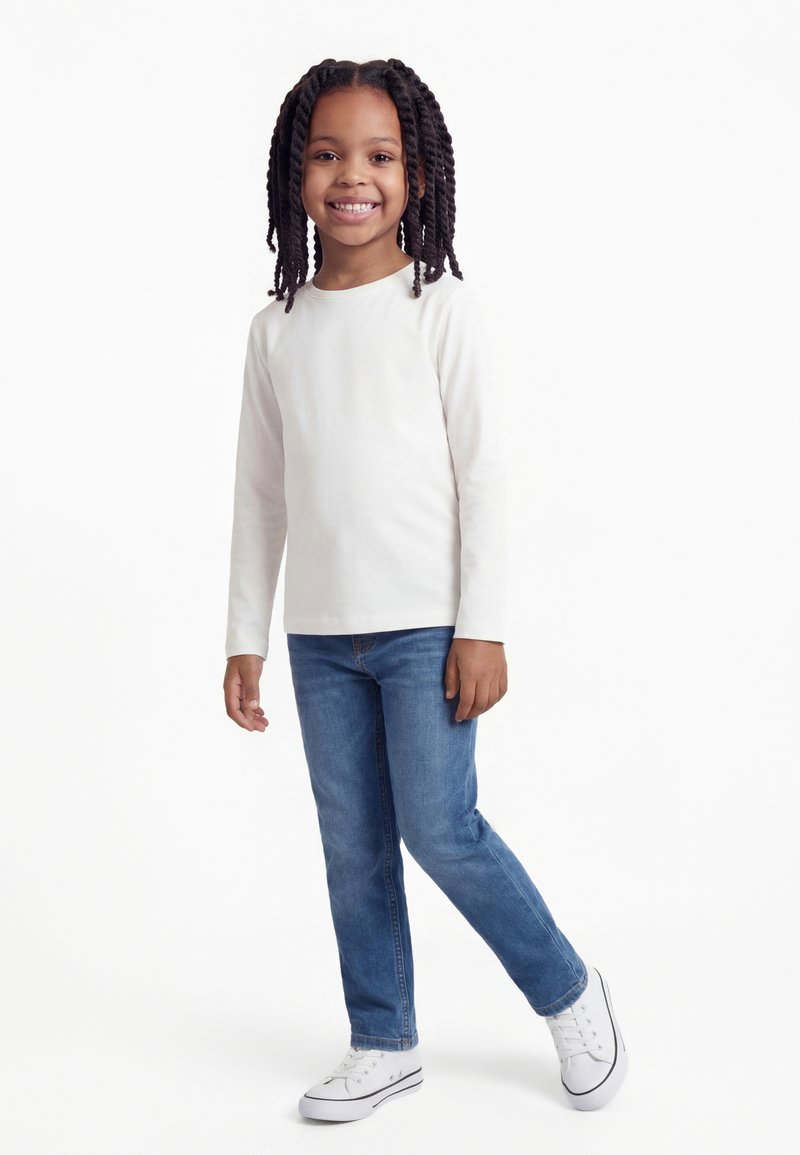 Lachend kind met gevlochten haar, gekleed in een wit shirt met lange mouwen, blauwe spijkerbroek en witte sneakers, staat voor een effen witte achtergrond.