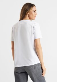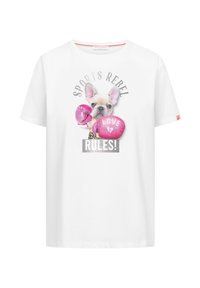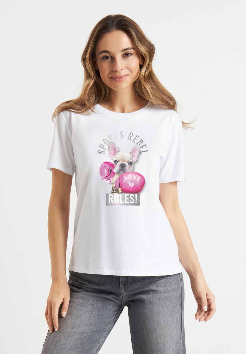 Vrouw draagt wit t-shirt met een Franse bulldog met roze bokshandschoenen en tekst "Sport is rebel," "Liefde" en "Regels!"