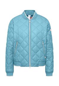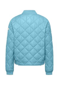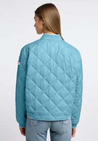 Jonge vrouw die een lichtblauwe gewatteerde bomberjack, lichtblauwe spijkerbroek en beige plateau sneakers draagt, staand tegen een witte achtergrond.