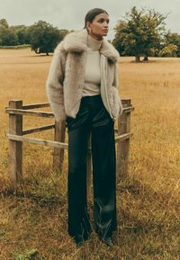 Vrouw in een beige nepbonten jas over een witte coltrui, zwarte wijde leren broek en met een beige clutch in de hand.
