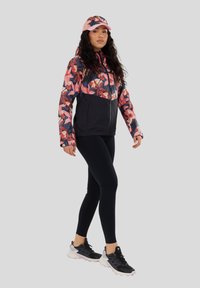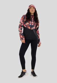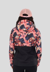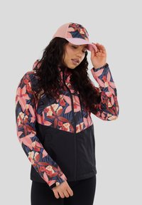 Vrouw met lang donker haar, gekleed in een zwarte jas met roze bloemmotief en een bijpassende roze pet met bloemprint, staand tegen een grijze achtergrond.