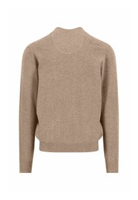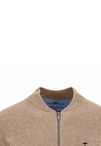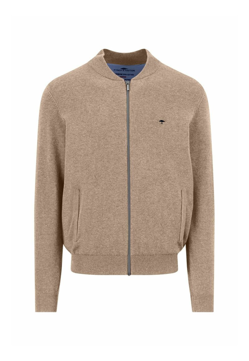 Lichtbruine ritsvest met geribde kraag, manchetten en zoom, voorzien van twee voorzakken en een klein zwart geborduurd logo op de borst.