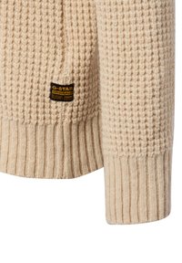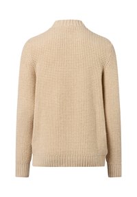 Beige gebreid sweater met een hoge hals, ribgebreide manchet en onderkant. Het materiaal heeft een geweven patroon, wat zorgt voor een gezellige uitstraling en pasvorm.
