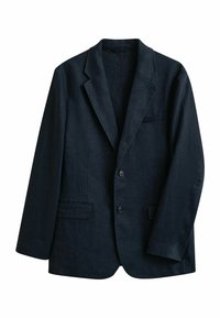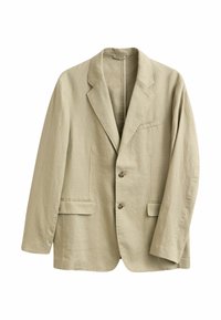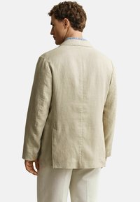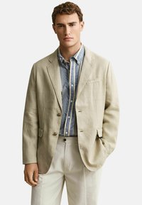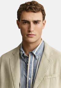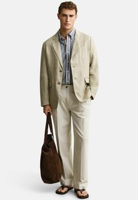 Jonge man die een beige blazer draagt over een blauw-wit gestreept overhemd en lichtbeige broek, staand met één hand in de zak.
