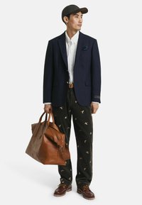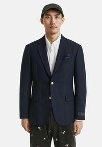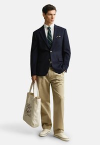 Man draagt een marineblauw colbert met gouden knopen, wit overhemd, groen gestreepte stropdas, patroon gekleurd pochet en beige broek tegen een witte achtergrond.
