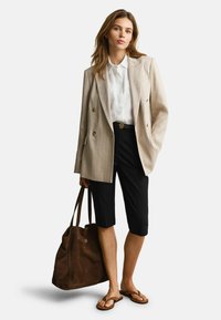 Vrouw met lichtbruin haar die een mouwloos wit overhemd met knopen en een zwarte broek draagt, met in één hand een beige gestreepte jas.
