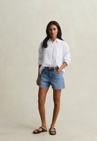 Vrouw met lang donker haar, gekleed in een wit overhemd met opgerolde mouwen en een korte blauwe spijkerbroek met een bruine riem.