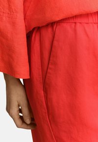Vrouw draagt felrode losse korte broek en bijpassende lange mouwen top met bruine sandalen, staat met één hand in de zak.