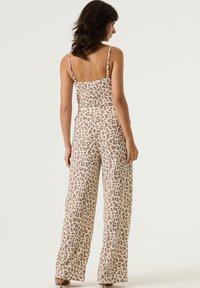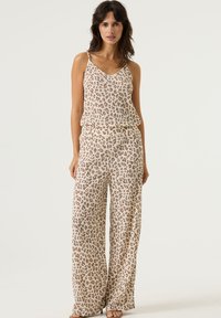 Jumpsuit met luipaardprint van een lichtgewicht, zachte stof. Heeft een V-hals, spaghettibandjes en een broek met brede pijpen in beige- en bruintinten.