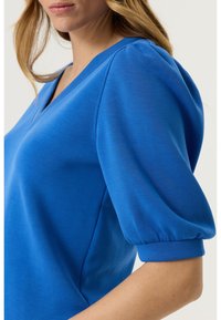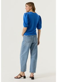 Vrouw staand in een blauw V-hals top met pofmouwen, lichtblauwe spijkerbroek en bruine sandalen met hakken, tegen een effen achtergrond.