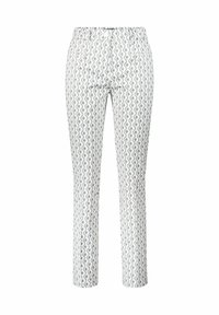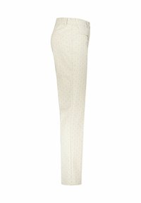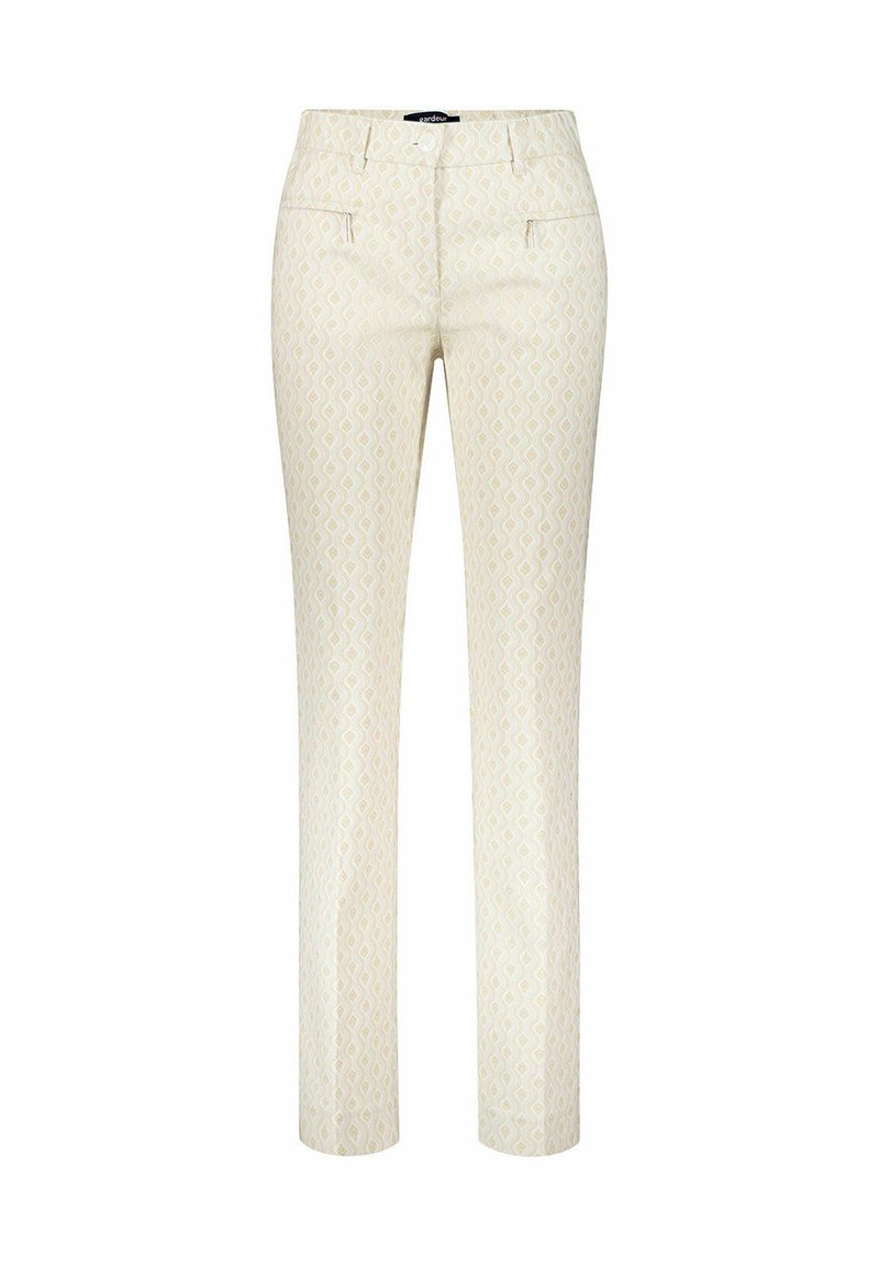 Crème kleurige slim-fit broek met subtiel geometrisch patroon, voorzijde met knoop- en ritssluiting en zij-inzetzakken, weergegeven op een witte achtergrond.