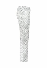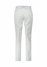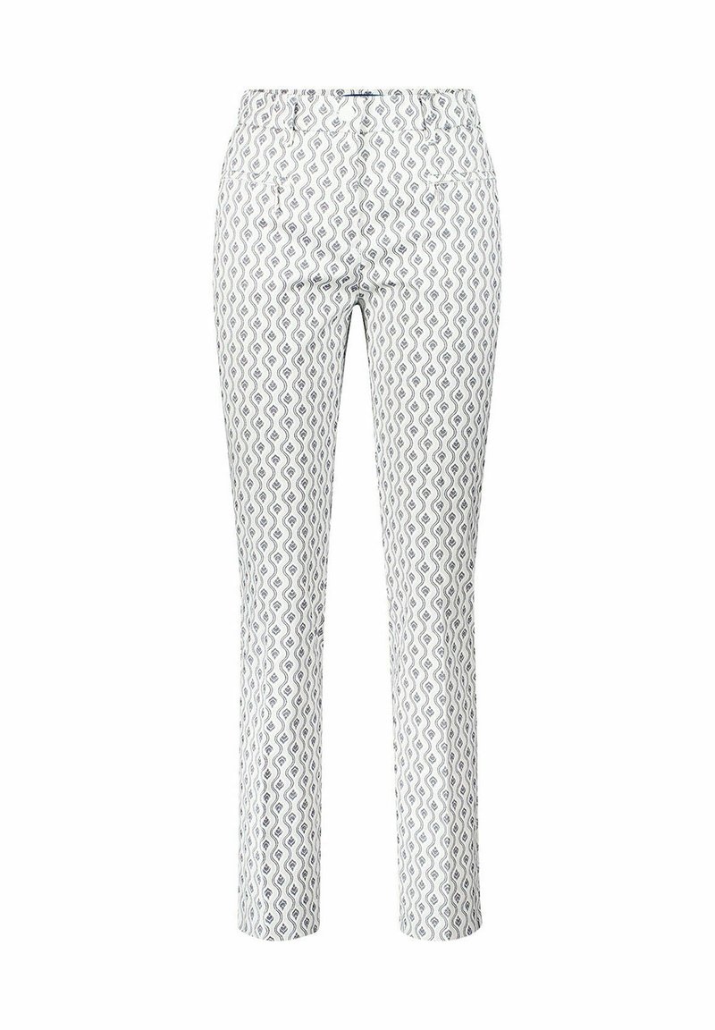 Witte slanke broek met golvend grijs geometrisch patroon, achterzakken en riemlussen, gezien vanaf de achterkant tegen een effen achtergrond.