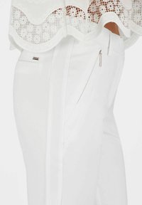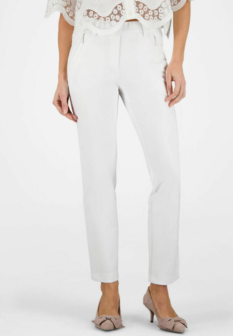 Vrouw met witte slim-fit broek met voorvakken met ritssluiting, gecombineerd met beige hakken en een witte kanten top.