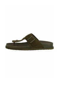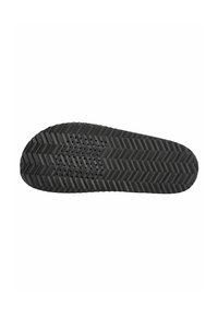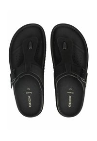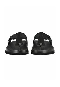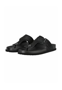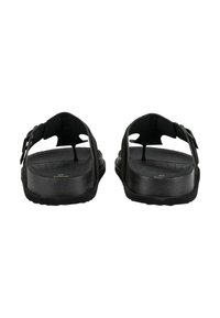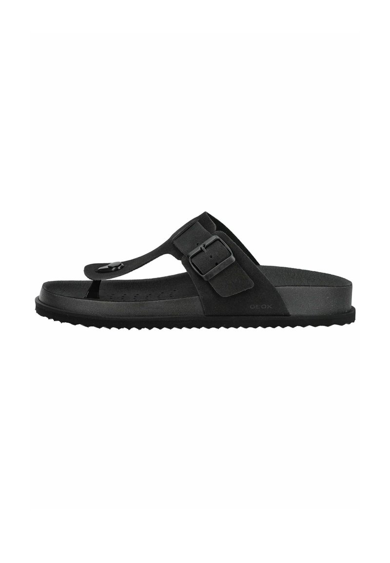 Zwarte sandaal met open tenen en teenriempje, verstelbare gesp, gevormde voetbed en een gestructureerde zool voor grip.