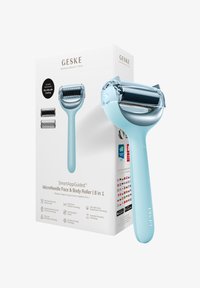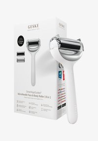 Plaats de naaldroller op het apparaat. Reinig uw gezicht en bereid u voor om fijne rimpels te verwijderen. Het resultaat: Gezonde, stralende huid. Schakel de huidvernieuwende SmartSonic Pulsatietechnologie in door de aan/uit-knop 2 seconden ingedrukt te houden. Verdeel uw gezicht in 4 kwadranten en rol gedurende 15 seconden over elke sectie in verticale, horizontale en diagonale lijnen. Rol vervolgens 60 seconden over de hals en daarna 60 seconden over het decolleté om uw huid te vernieuwen en steviger te maken. Schakel het apparaat uit door de aan/uit-knop 2 seconden ingedrukt te houden. Breng een GESKE-serum aan op gezicht en hals om het anti-verouderingseffect van uw MicroNeedle Rolling-sessie te maximaliseren. Spuit ten slotte de naaldroller in met desinfecterende spray. Laat ze aan de lucht drogen. Reinig uw apparaat na elk gebruik met onze biologische apparaatreiniger.