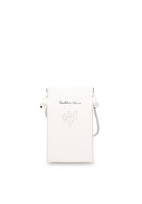 Zwart gestructureerd leren etui met een dunne band, gouden logotekst en een geperforeerd hartmotief aan de voorkant.