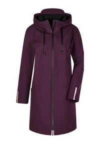 Lichtgroene waterdichte jas met een capuchon, zwarte trekkoorden en zijzakken. Lange mouwen met een relaxte pasvorm en ritssluiting.