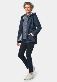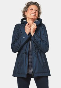Marineblauwe waterdichte jas met een trekkoord taille, ritssluiting en capuchon. Voorzien van drukknoopsluitingen en een gestreepte voering.