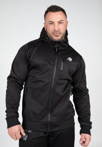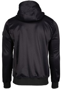 Zwarte zip-up jas met een capuchon, voorzien van een voorzak en een logo. Soepele, rekbare stof met ribgebreide manchetten en zoom.